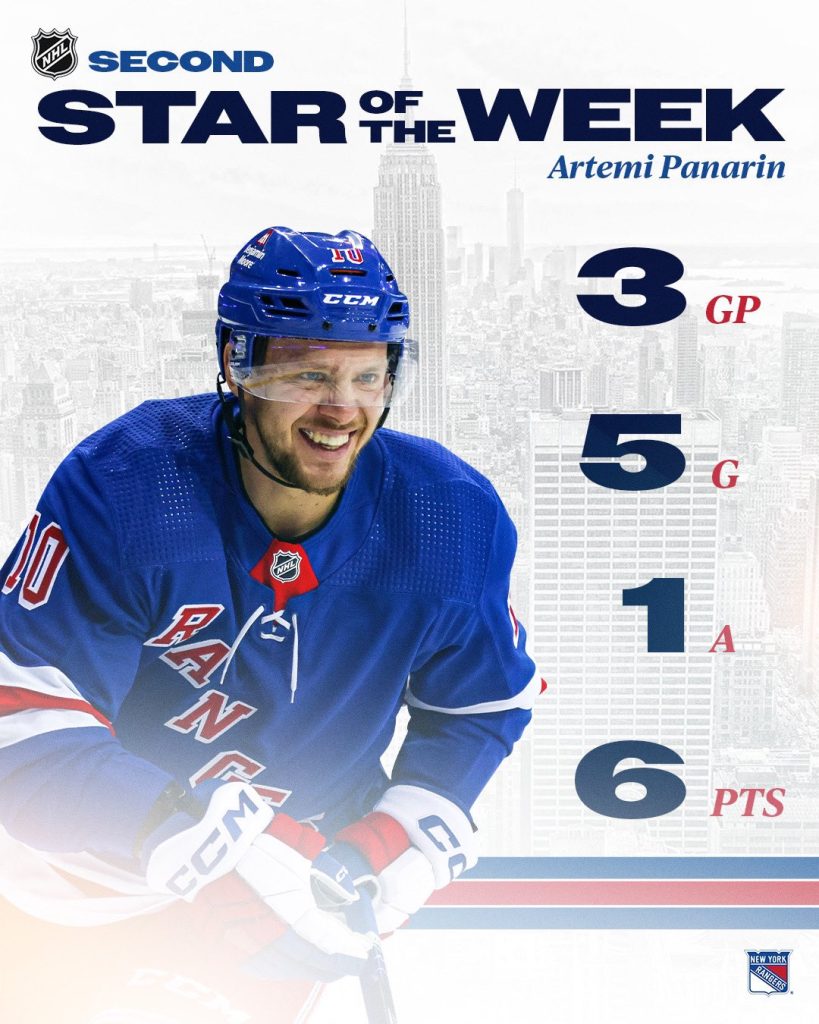 - Artemi Panarin would record five goals and one assist for six points in three games played for the New York Rangers. Panarin would open his week with a goal and an assist in a 5-1 victory over Washington on Dec. 27th, and on Dec. 29th he would record a goal in a 4-3 loss to Florida. Then to close out the week Panarin would record a hat trick to give the Rangers the 5-1 victory over Tampa Bay on Dec. 30th.